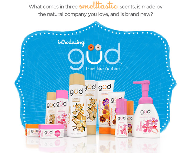 Introducing güd, from the makers of Burts Bees! güd offers natural shampoos, conditioners, hand washes, hand creams, body lotions, body butters, body washes and body mists available in 4 amazing scents: Orange Petalooza, Floral Cherrynova, Vanilla Flame, and Pearanormal Activity.