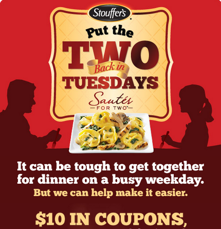 Stouffer’s is offering two separate offers right now. On the “America’s Favorite” tab you will find a coupon to save $2.00 on any Stouffer’s entree 32 oz. or larger. On the “Two Back in Tuesdays” tab, you can register for weekly coupons on the Stouffer’s chef-inspired Sautés for Two meals!