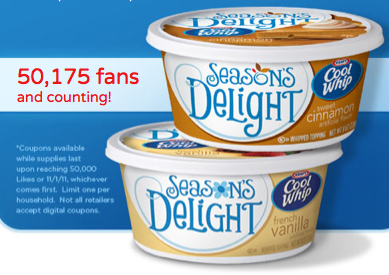 Hurry to the Cool Whip Facebook page to snag a coupon valid for 75¢ off any Cool Whip Season’s Delight Whipped Topping (no size restrictions!)