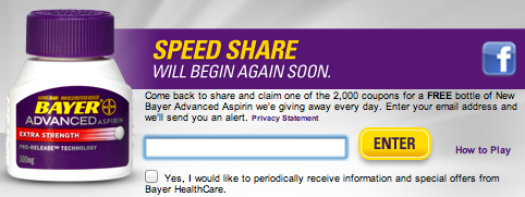 Bayer will be giving away 2,000 FREE bottles of New Extra Strength Bayer Advanced Aspirin 20ct or Regular Strength Bayer Advanced Aspirin 24ct every day. To increase the odds of scoring a free bottle, you will want to enter your email address here (as pictured below).