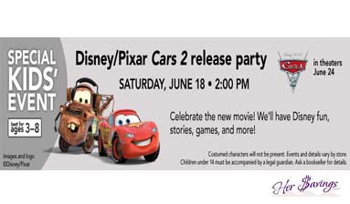 Here's a fun, FREE event to take the kiddos to! On June 18, 2pm at participating Borders book stores, you can bring your kids in to enjoy a Disney Pixar Cars 2 Release Party! The FREE afternoon activities include Disney stories, games and more, aimed at kids 3 to 8 years old.