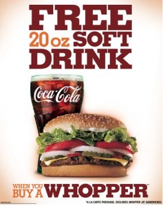 you a FREE 20 ounce soft drink with purchase of a Whopper (available