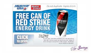 Get one 16oz can of Red Strike FREE at participating Murphy USA and Murphy Express locations. Limit of one coupon per person.