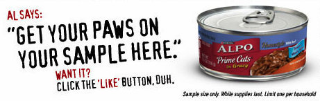 Hurry to the ALPO Facebook page, “like” them, click on the “New Breed” tab (left side), then scroll down and click on “Get Your Paws on Your Sample Here” to score a FREE sample of ALPO Brand dog food.