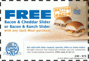 “Like” White Castle on Facebook, click on the Better with Bacon tab and you will be able to print a coupon for a FREE Bacon & Cheddar Slider or Bacon & Ranch Slider with the purchase of any Sack Meal! Coupon expires June 30th. You can also print a coupon for $3 off a Crave Case of any 30 Sliders!