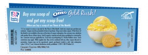 Buy one scoop of Oreo Gold Rush ice cream and get any scoop FREE! Coupon expires May 6th.