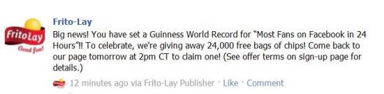 Tomorrow, April 29th at 2:00 pm CT, Frito Lay will be giving away 24,000 FREE bags of chips on their facebook page! This is a thank you to to all their fans for setting a Guinness World Record for “Most Number of Fans on Facebook in 24 Hours”!