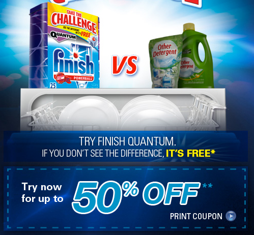 Head on over to the Finish Dishwashing Facebook page, like them and then click on the “Coupon” tab to print a high value coupon valid for $1.75/1 ANY Finish Quantum product.