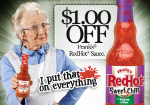 Head on over to the Frank’s RedHot Facebook page and click on the “Coupons” tab to print a coupon valid for $1/1 Franks RedHot Thick sauce or Sweet Chili Sauce or any other Frank’s Redhot Sauce!