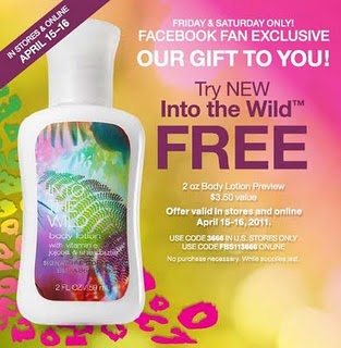 Our Gift to You: Friday and Saturday only, we’re giving all of our Facebook Fans an exclusive FREE GIFT — try our NEW Into the Wild 2 oz Body Lotion Preview FREE! No purchase necessary. While supplies last.