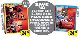 Cars and The Incredibles Blu-Ray/DVD Combo Packs will be released tomorrow, 4/12. Plus, each Combo packs includes a Free Movie Ticket for Cars 2 in theaters, June 24th!