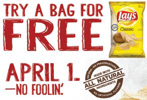 On April 1, 2011 Kroger/Ralphs stores are giving away FREE Sample Size Bags of Sun Chips/Frito-Lay chips from 3pm to 8pm.