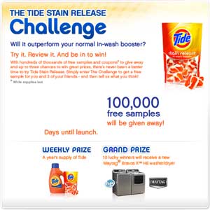 The first 100,000 get a FREE Full Size Tide Stain Release for You and 3 of Your Friends when you “Like” Tide on Facebook and Click the “The Challenge tab” This is over a 14 week period.