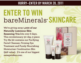 Bare Escentuals Cosmetics is giving away 1,000 of their Naturally Luminous Skin Renewing Trio kits over the next 6 days on Facebook. It’s a revolutionary 30-day, 3-piece Try Me kit that retails for $26! Head on over here to enter and hopefully some of you will get lucky!?