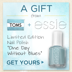 Through April 5th, head on over to the TOMS Shoes Facebook page, “like” them, and then scroll down to the bottom of the page (look in the lower left corner for the picture above) to enter to win a FREE bottle of Essie Limited Edition “One Day Without Blues” Nail Polish ($8 value!).