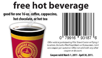 To get a FREE Coffee, Cappuccino, Hot Chocolate or Hot Tea at Pilot Travel Center “Like” Pilot Travel Center on Facebook, then click the “Coupon” tab.
